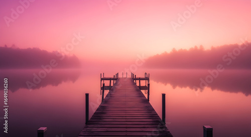 © Bangga, Fototapeta premium Foggy Lake Pier Pink Misty Landscape Serene Calm Atmospheric Tranquility