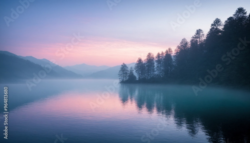© Genseed, Fototapeta premium Foggy Lake with Forest Reflection at Sunrise