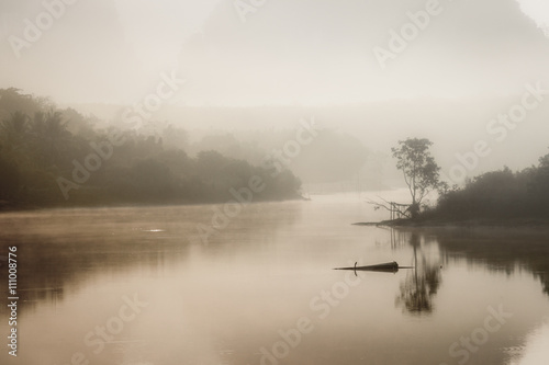 © juthamaso, Fototapeta premium Foggy landscape with a tree silhouette on a fog over lake