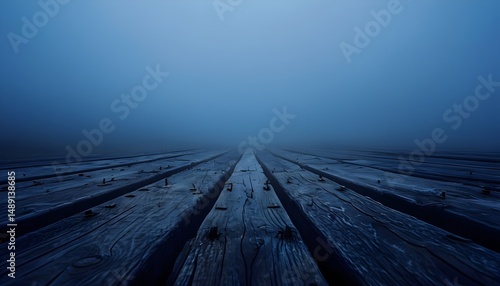 Obraz premium Foggy Landscape With Weathered Wooden Planks Leading Into Mist