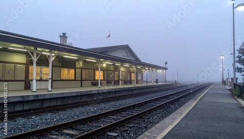 © Kitta Studio, Obraz premium Foggy Morning at Historic Train Station with Empty Tracks and Lights