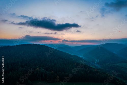 © Jakub Łukasik, Fototapeta premium Foggy morning at the green mountains. Orange colors in the sky during sunrise.