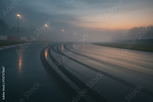 Fototapeta premium Foggy Morning Circuit with Dramatic Light Reflections and Racing Atmosphere