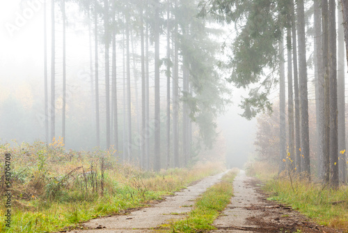 © Sergey Fedoskin, Obraz premium Foggy morning in the forest. Autumn landscape.