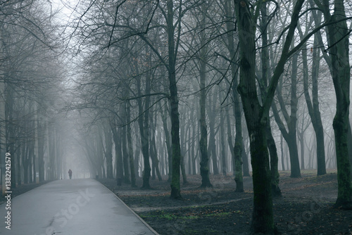 © liusan , Obraz premium Foggy morning in the park, silhouettes of trees
