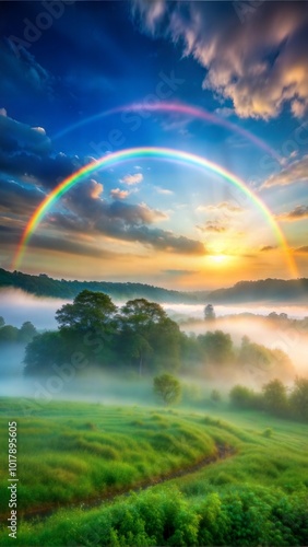 Naklejka premium foggy morning landscape with a vibrant rainbow arc background