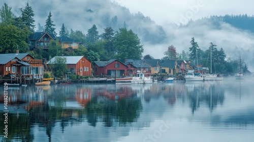 © Egriva, Fototapeta premium Foggy Morning on a Picturesque Lake Community with Reflected Architecture