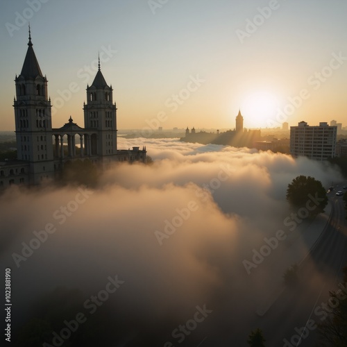 © Pixel Matrix, Fototapeta premium Foggy morning panoramic view of a city at dawn featuring rising sun through fog