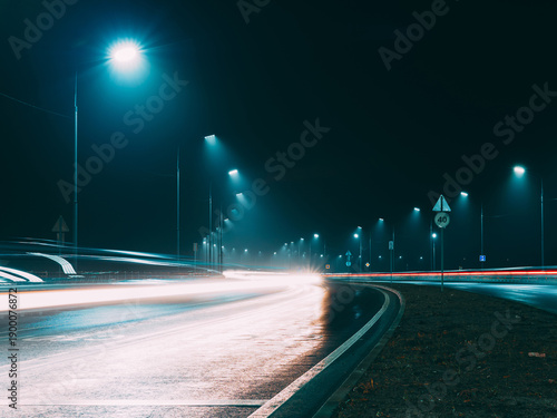 © pavelkant, Naklejka premium Foggy night highway , car tracks