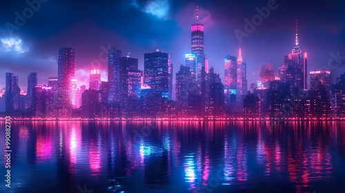 © Indronath, Fototapeta premium Foggy night lights up dark rooftops glowing neon graffiti bright picture