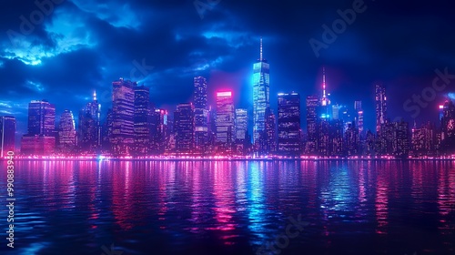 © Indronath, Fototapeta premium Foggy night mist over dark rooftops glowing with neon graffiti picture
