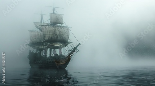 © Bipul Kumar, Fototapeta premium Foggy Ocean Adventure: Vintage Sailing Ship in the Fog