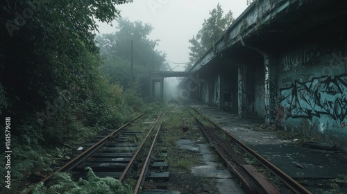 Fototapeta premium Foggy, overgrown abandoned train tracks.