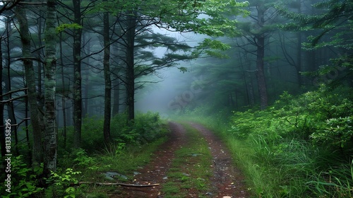 © Galib, Fototapeta premium Foggy path in the middle of a lush green forest. The path is surrounded by tall trees and dense vegetation.