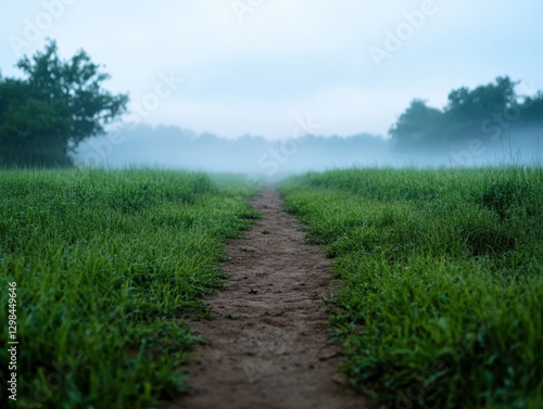 Obraz premium Foggy Path through a Green Meadow