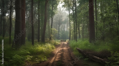 Obraz premium Foggy path through the forest ,Sunset in a dark forest with rays of light passing through the trees.Generative Ai