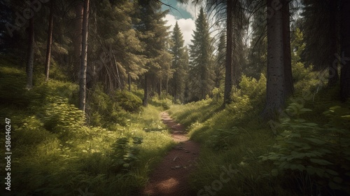 Obraz premium Foggy path through the forest ,Sunset in a dark forest with rays of light passing through the trees.Generative Ai