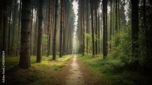 © Rudsaphon, Naklejka premium Foggy path through the forest ,Sunset in a dark forest with rays of light passing through the trees.Generative Ai