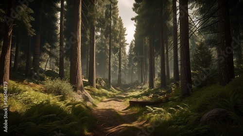 Obraz premium Foggy path through the forest ,Sunset in a dark forest with rays of light passing through the trees.Generative Ai
