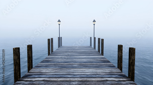 Naklejka premium Foggy pier extending into calm water, two lamps on either side, misty...