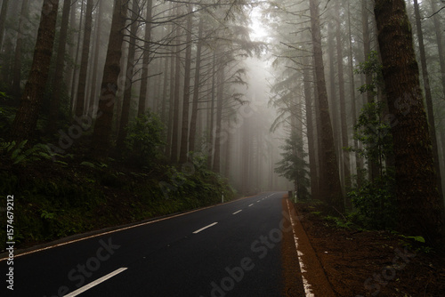 © Stoca, Fototapeta premium Foggy pine forest road with dense trees Horizontal