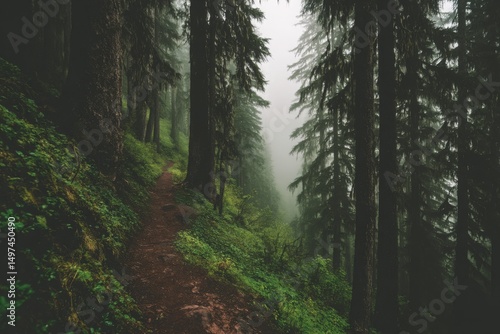 Obraz premium foggy pine forest trail with misty air and wet ground in a serene woodland...