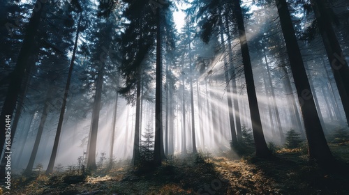© Kitta Studio, Obraz premium Foggy Pine Forest with Sunlight Rays Illuminating the Ground