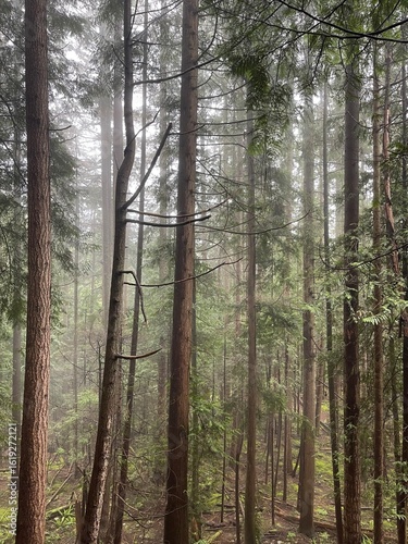Obraz premium Foggy Pine Forest with Tall Trees in Vancouver