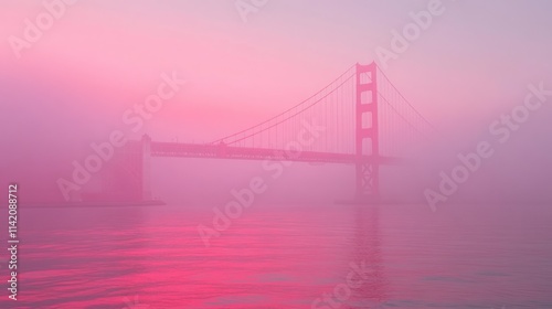 Fototapeta premium Foggy pink sunrise over suspension bridge.
