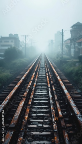 © Firman Dasmir, Fototapeta premium Foggy railway track leading into the distance with a muted cityscape backdrop