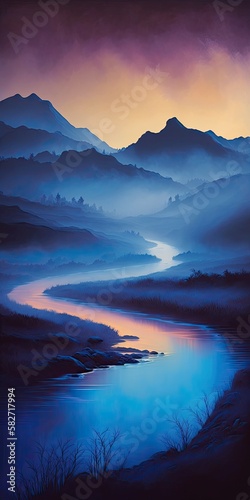 © Luise, Obraz premium Foggy River at Sunset, generative ai