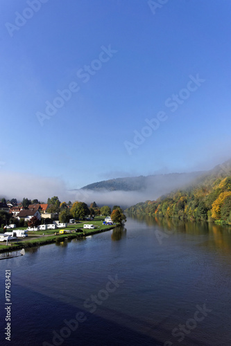 Fototapeta premium foggy river landscape and forest in autumn colors