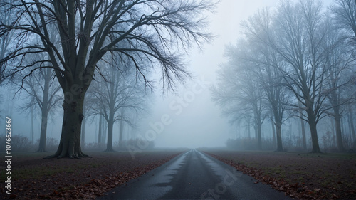 © Andrey, Obraz premium Foggy road between trees at dawn