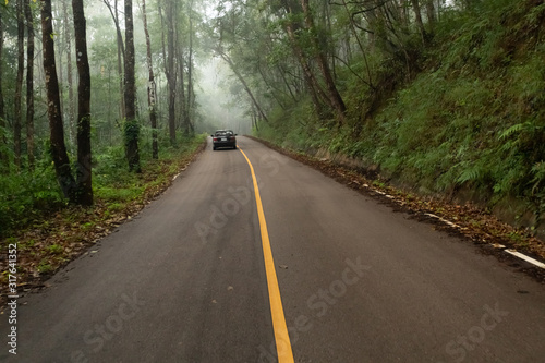 © rnophoto, Obraz premium Foggy road on the mountain with a car in background.