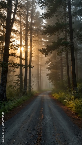 © claudunia, Fototapeta premium Foggy road through a forest at sunrise.