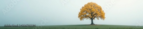 Naklejka premium Foggy sky reflects off the bright yellow leaves of a lone oak tree, nature, solo