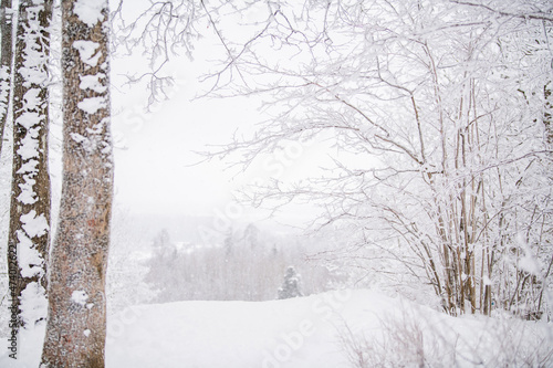 © Maria Moroz, Fototapeta premium Foggy snowy landscape of northern park. Soft focus.