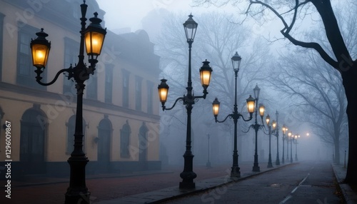 © saxti, Fototapeta premium Foggy street with vintage gas lamps casting eerie shadows