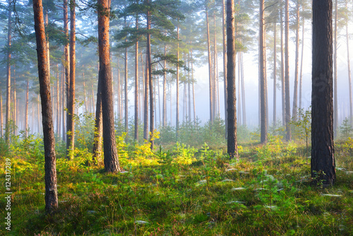 © Alex Stemmer, Fototapeta premium Foggy sunrise in the deciduous forest in Latvia.