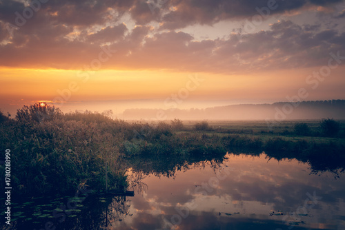 © Aga Bak, Fototapeta premium Foggy sunrise over Dutch wetlands with warm golden light, calm water reflections and tall reeds. Peaceful rural landscape in the Netherlands.