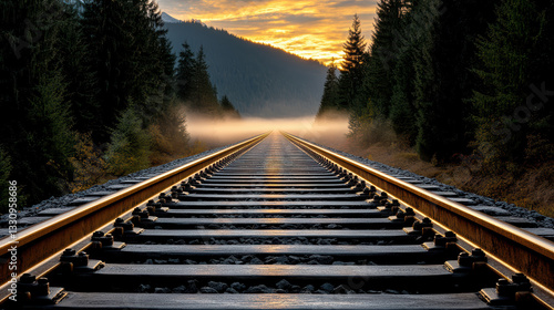 © siraphol, Fototapeta premium foggy sunrise over forgotten railway tracks, creating serene atmosphere