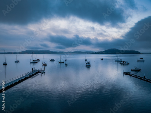 © Merrillie, Naklejka premium Foggy sunrise over the water with boats