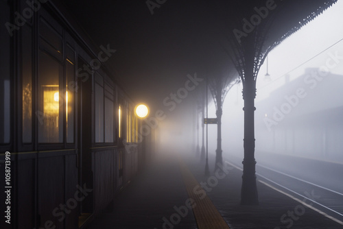 © plysuikvv, Fototapeta premium Foggy train station platform at dawn with lights glowing