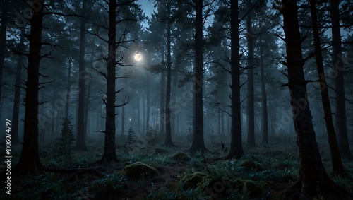 Obraz premium Foggy twilight forest with a moonlit glow.