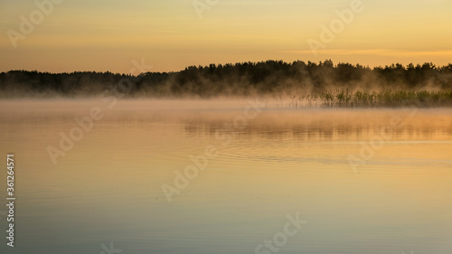 © ANDA, Fototapeta premium Foggy weather early in the morning on the lake. beautiful wallpapers. a mystical mist vibrates in the lake. summer sunrise