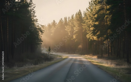 Fototapeta premium Foggy winding road cutting through a sun-kissed pine forest, creating a...