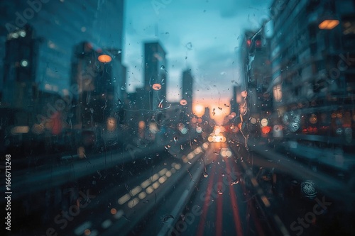 © vxnaghiyev, Fototapeta premium Foggy window with abstract street lamps and blurred backdrop
