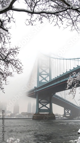 © gelas, Fototapeta premium Foggy winter cityscape with bridge