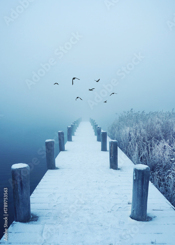 © Jenny Sturm, Fototapeta premium foggy winter morning near the wooden pier at lake