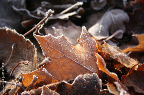 © saratm, Fototapeta premium Foglie coperte dal gelo in inverno illuminate dal sole